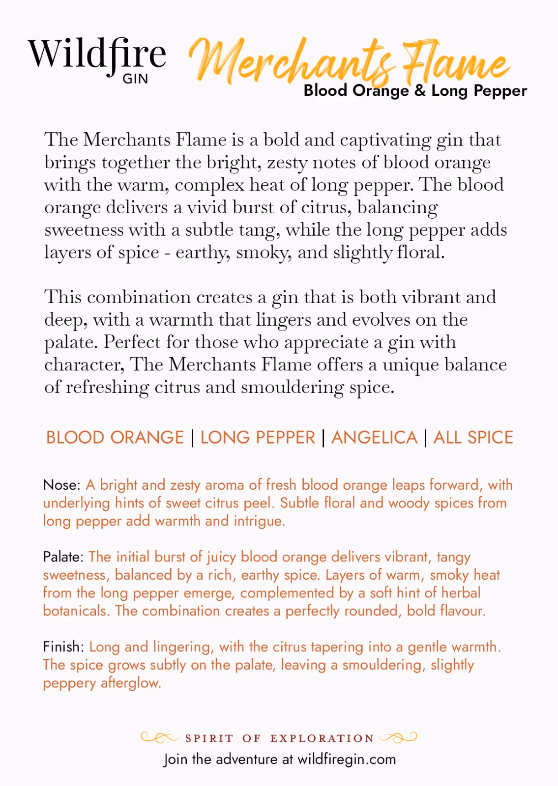 Merchant’s Flame is the result — a vivid, spiced gin that balances the brightness of blood orange with the smouldering complexity of long pepper. It’s bold but balanced, exotic yet deeply drinkable. A gin that evolves on your palate and lingers like the final embers of a shared fire.